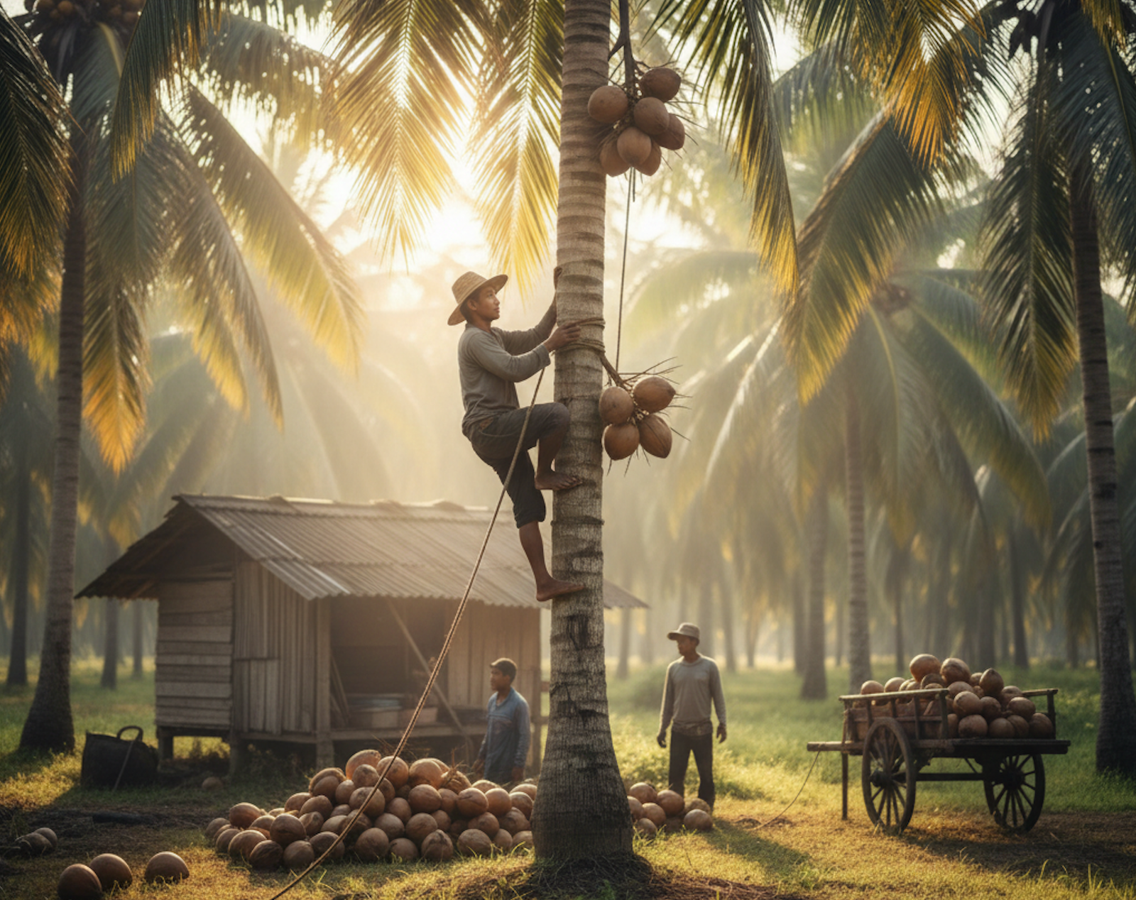 • Waktu Emas: Kelapa terbaik dipanen pada usia 11 hingga 13 bulan. Panen yang terlalu muda menghasilkan daging buah tipis dan rendemen minyak rendah. Panen yang terlalu tua (di atas 13 bulan) rentan terhadap kerusakan sebelum diproses.